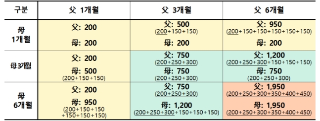 - 모 1개월 + 부 1개월 : 각각 상한 월 200만 원