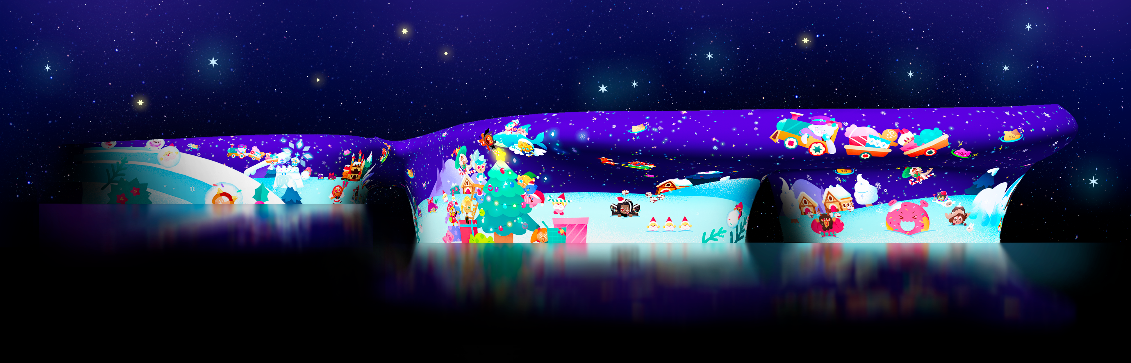 - 시즌 콘텐츠 데브시스터즈의 ‘쿠키런: 킹덤’ : 바삭한 쿠키와 크리스마스 오너먼트가 쏟아지는 장면을 연출, 18시 30분~21시 30분 매시 30분마다 상영합니다.